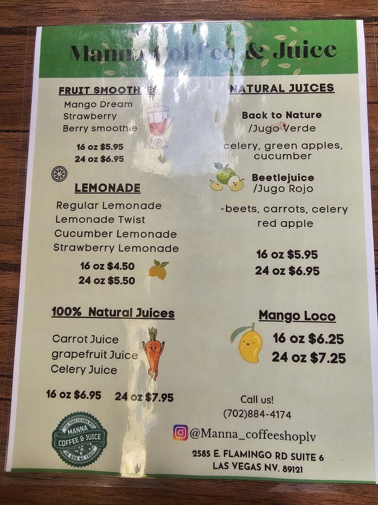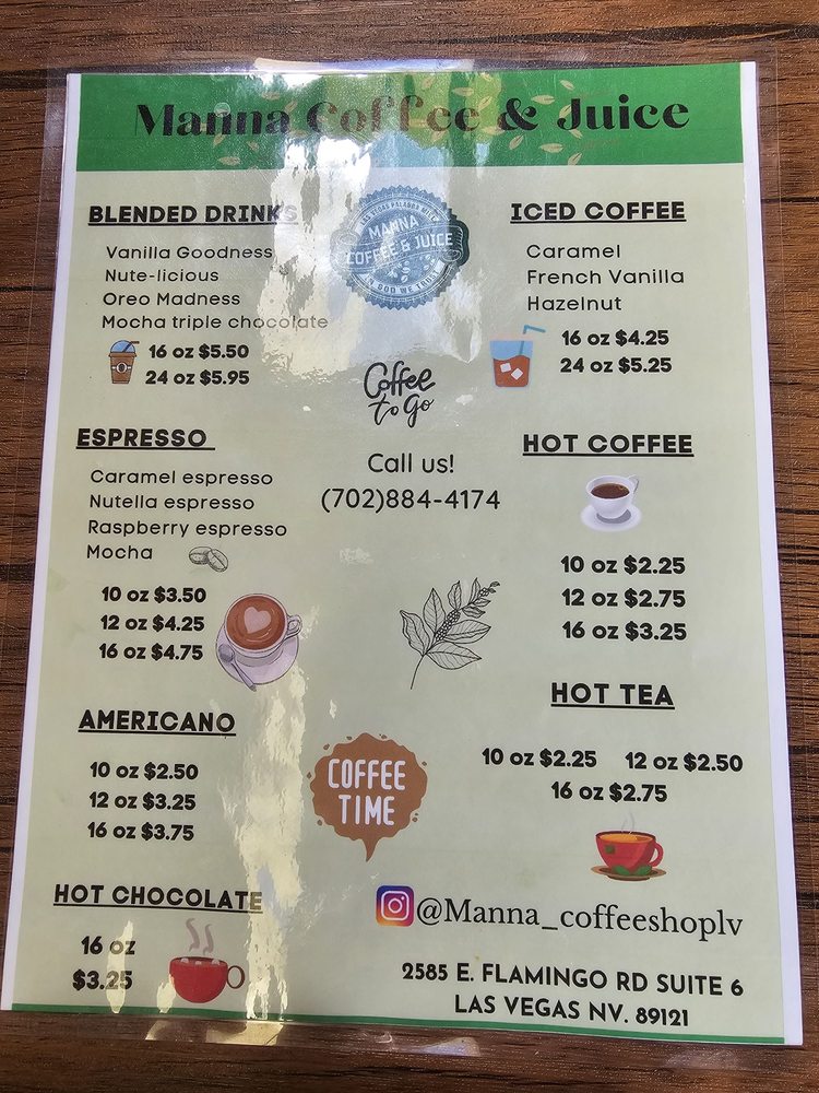 Welcome to Manna Coffee and Juice, a charming oasis located in Las Vegas at 2585 E Flamingo Rd. This delightful establishment captures the essence of community with its family-oriented vibe and inviting ambiance, enhanced by soft jazz music. Manna stands out for its dedication to quality, offering delicious homemade juices and a diverse range of coffees, all prepared with fresh ingredients right before your eyes.
